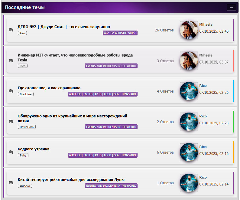 <script> /* Последние темы информер Подставляет аватар последнего комментатора. Логика: - берём ник последнего комментатора из .last_post .uLPost (или похожих селекторов) - проверяем кеш localStorage - пробуем fetch по href последнего коммента (и по варианту /index/8-0-USERNAME) - парсим страницу профиля и ищем <img> где src содержит /avatar/ или /ava/ - если нашли — ставим и кешируем; если нет — смотрим userMap; если и там нет — дефолт */ (function(){ 'use strict';